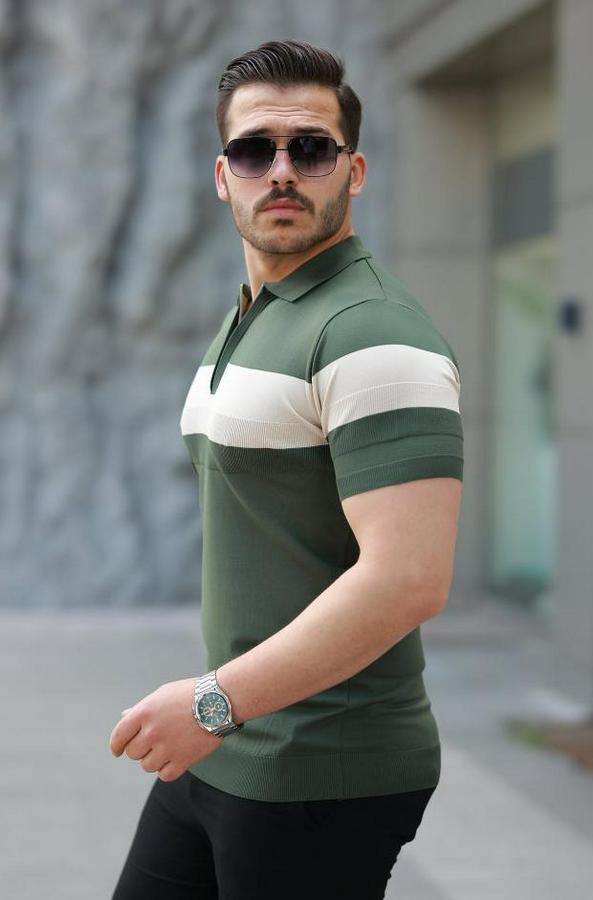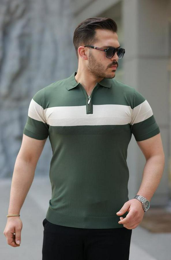 Fermuar Yakalı Şerit Renk Desenli Kısa Kollu Tişört
