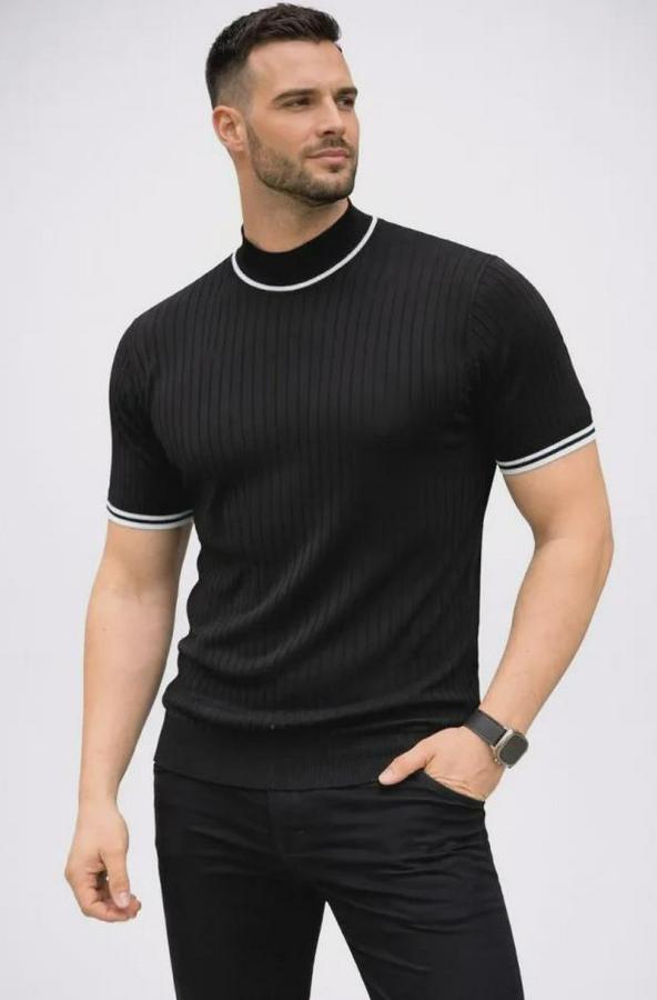 Erkek Fitilli Triko Dokuma Kısa Kol Tişört Yarım Boğaz Modern Yazlık T-Shirt - Siyah