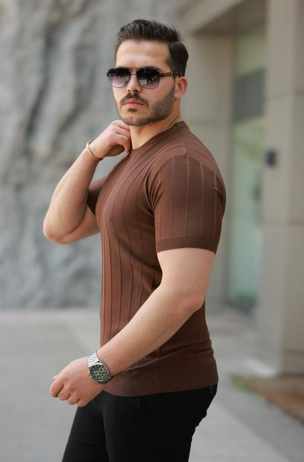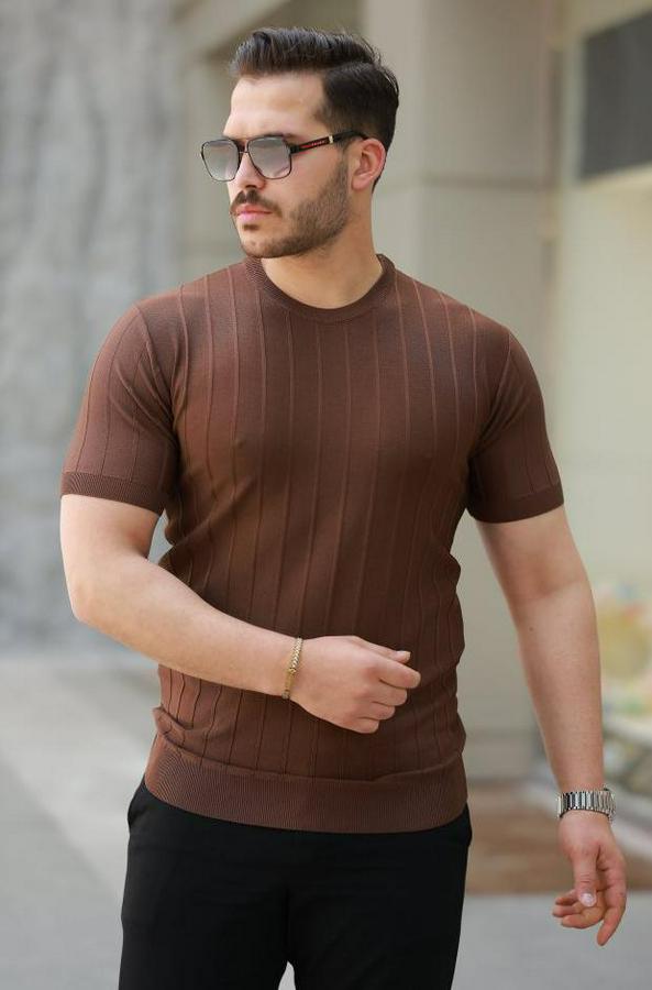AnasayfaTüm ÜrünlerÜst GiyimT-ShirtKısa Kollu Bisiklet Yaka Çizgili Triko Tişört