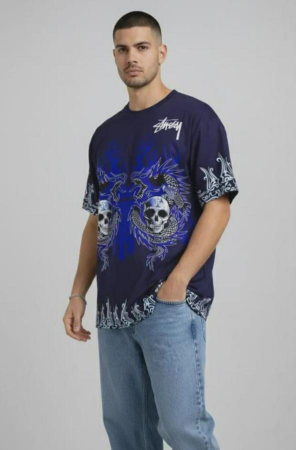 Erkek Lacivert Oversize Tişört Dragon - Kuru Kafa Baskılı Bisiklet Yaka Streetwear T-Shirt - Lacivert