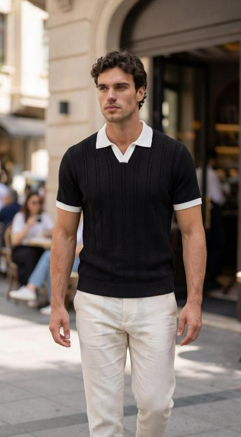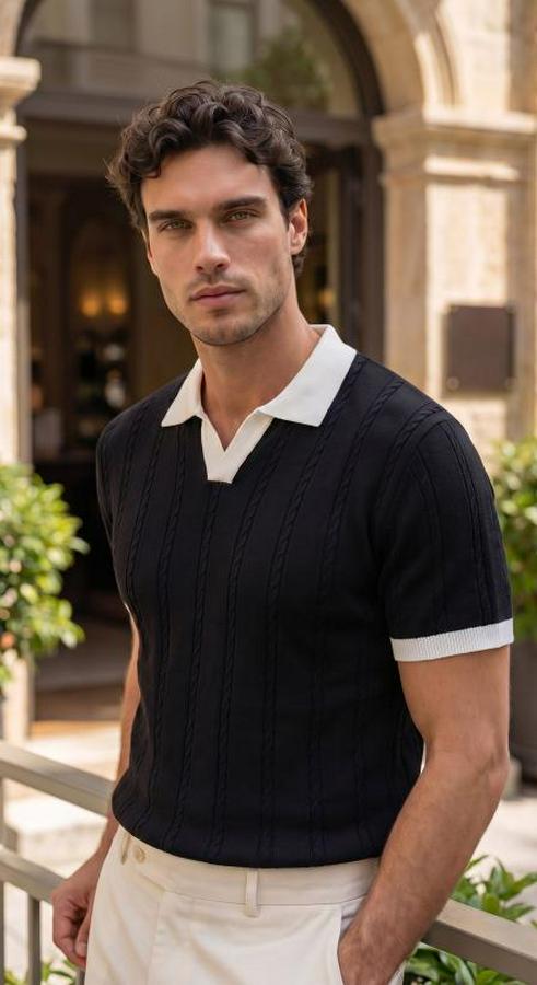 Erkek Örgü Desen Yakalı Kısa Kollu Triko Tişört - %100 Pamuk Akrilik