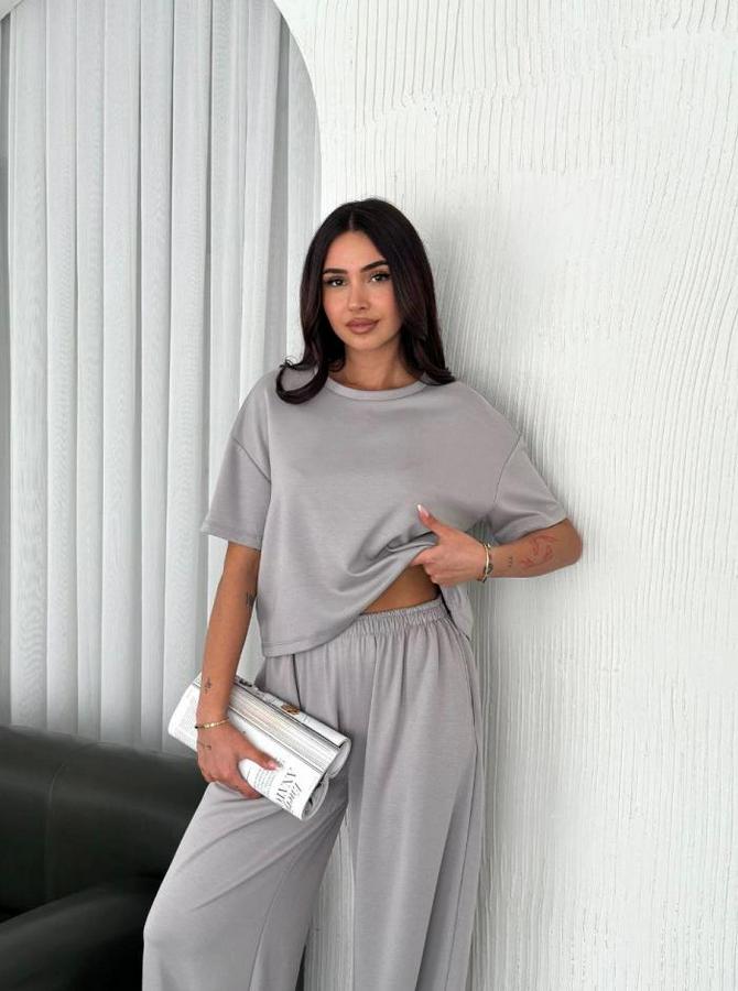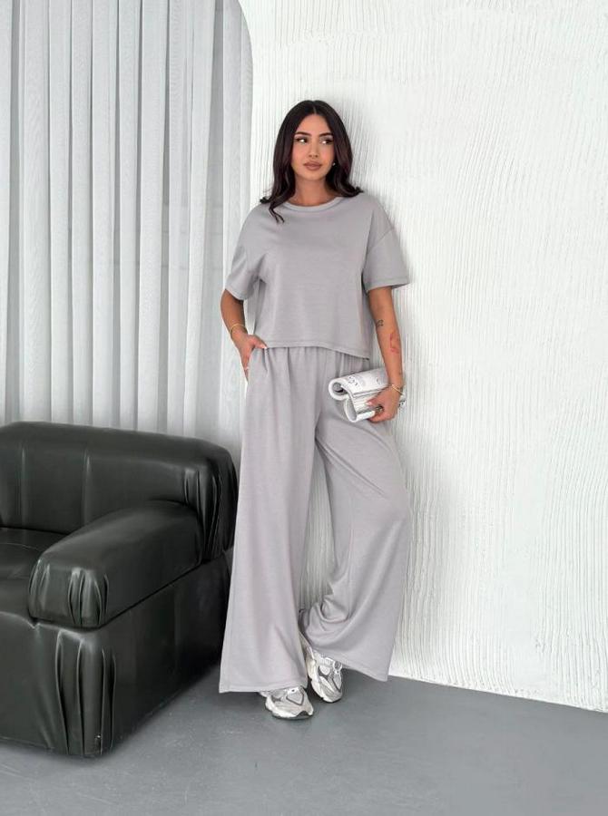 Osy Modal Yumuşak Dokulu Kumaş Bisiklet Yaka T-shirt Bol Paça Pantalon Ikili Takım - Boyalı Gri