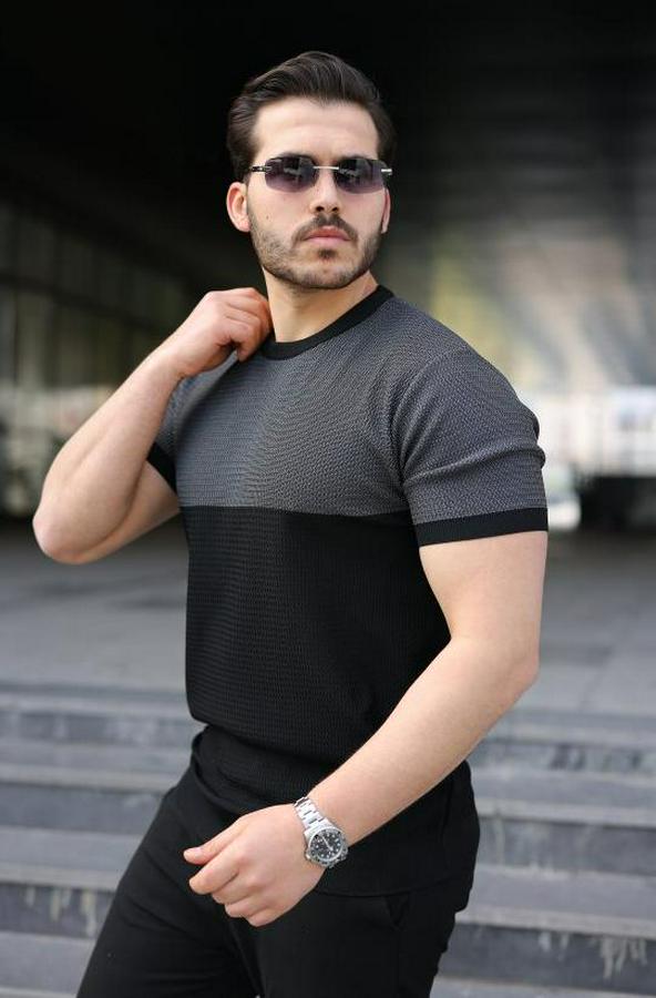 Erkek Renk Bloklu Bisiklet Yaka Kısa Kollu Triko Tişört