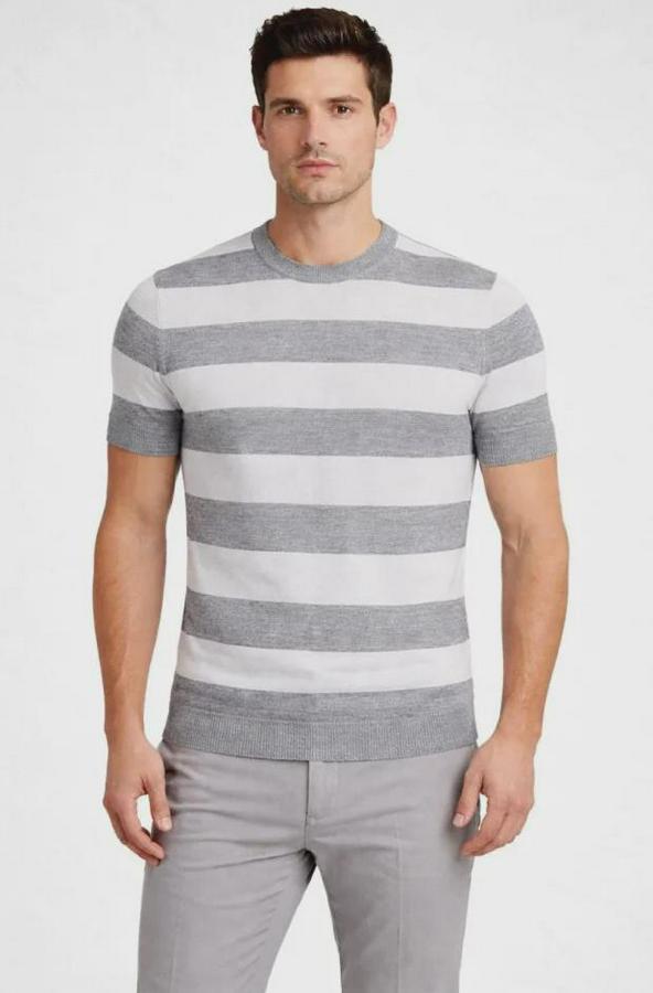 Erkek T-shirt Çizgili Triko Dokuma Bisiklet Yaka Tişört - Gri