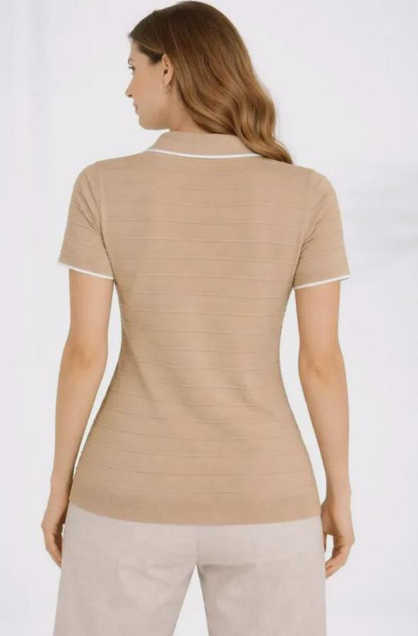Triko Kumaş Yakalı Düğmesiz Açık Yaka Fitilli Kısa Kollu Regular Fit Tişört T-shirt - Bej