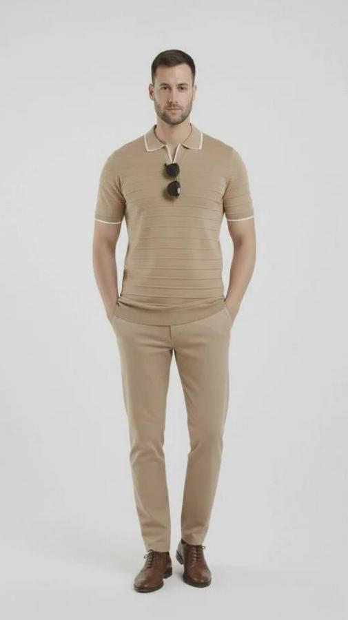 Erkek Triko Kumaş Yakalı Düğmesiz Açık Yaka Fitilli Kısa Kollu Regular Fit Tişört T-shirt - Bej