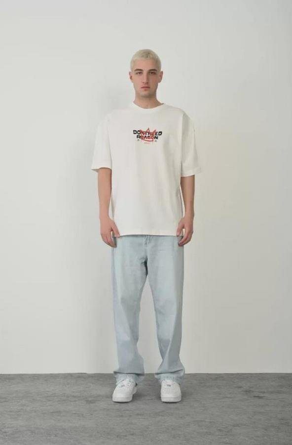 Unisex Baskılı Bisiklet Yaka Oversize T-Shirt - Beyaz