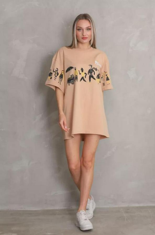 Unisex Bisiklet Yaka Baskılı Oversize T-Shirt - Bej