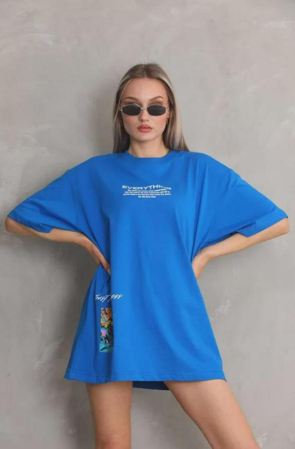 Unisex Bisiklet Yaka Baskılı Oversize T-Shirt - Mavi