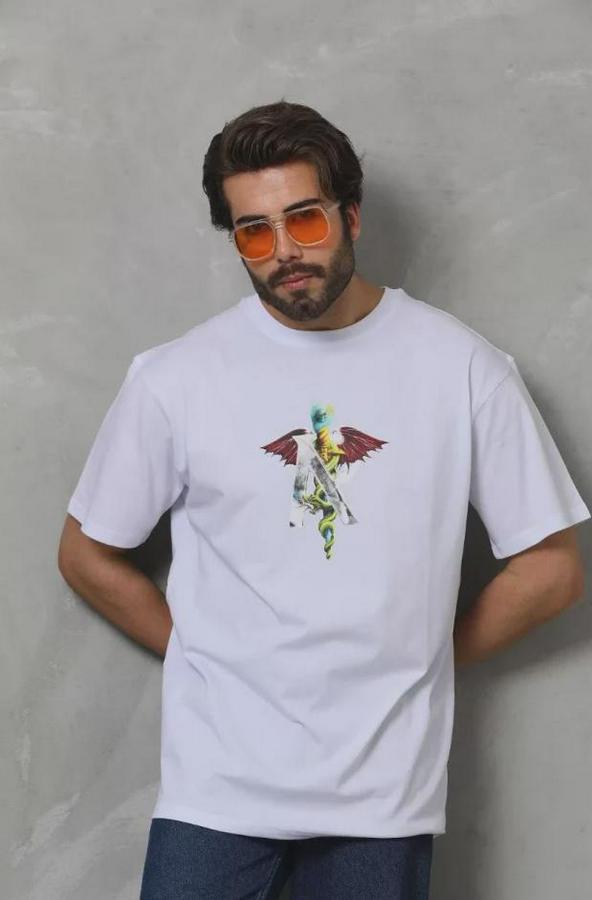 Unisex Bisiklet Yaka Baskılı Oversize T-Shirt - Beyaz