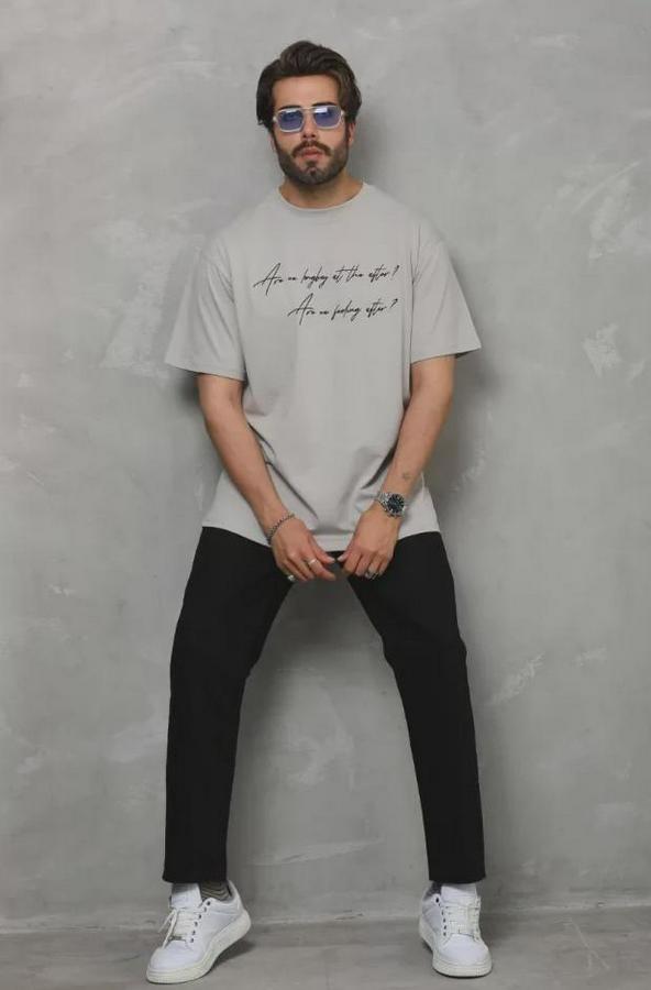 Unisex Bisiklet Yaka Baskılı Oversize T-Shirt - Gri