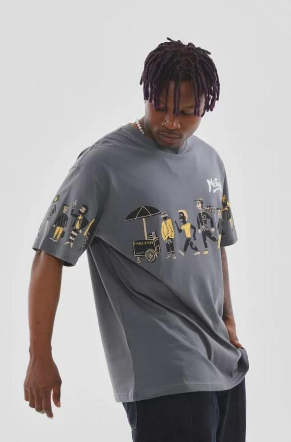 Unisex Bisiklet Yaka Baskılı Oversize T-Shirt - Gri