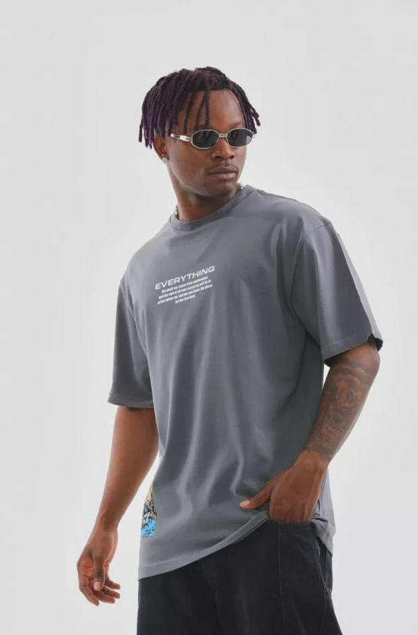 Unisex Bisiklet Yaka Baskılı Oversize T-Shirt - Gri