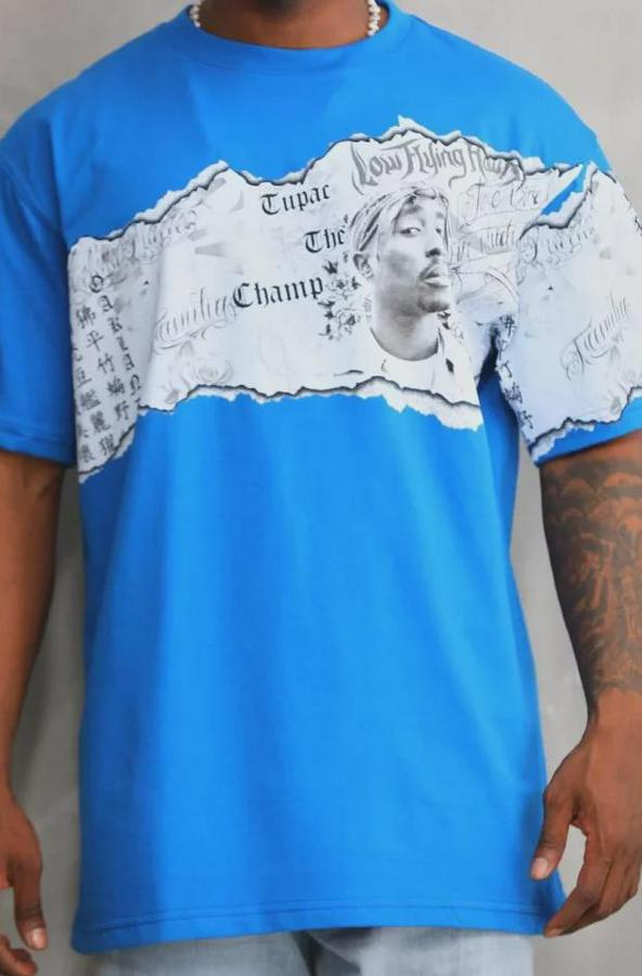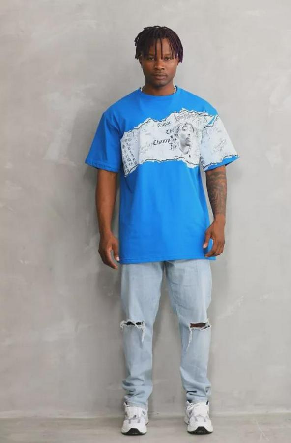 Unisex Bisiklet Yaka Baskılı Oversize T-Shirt - Mavi