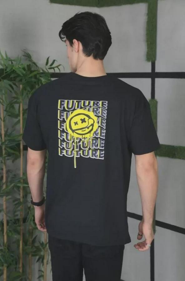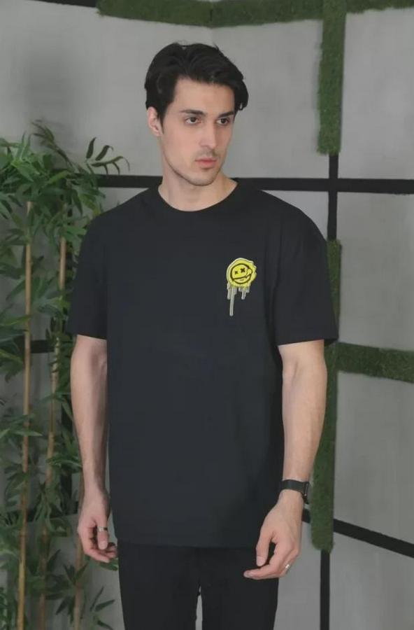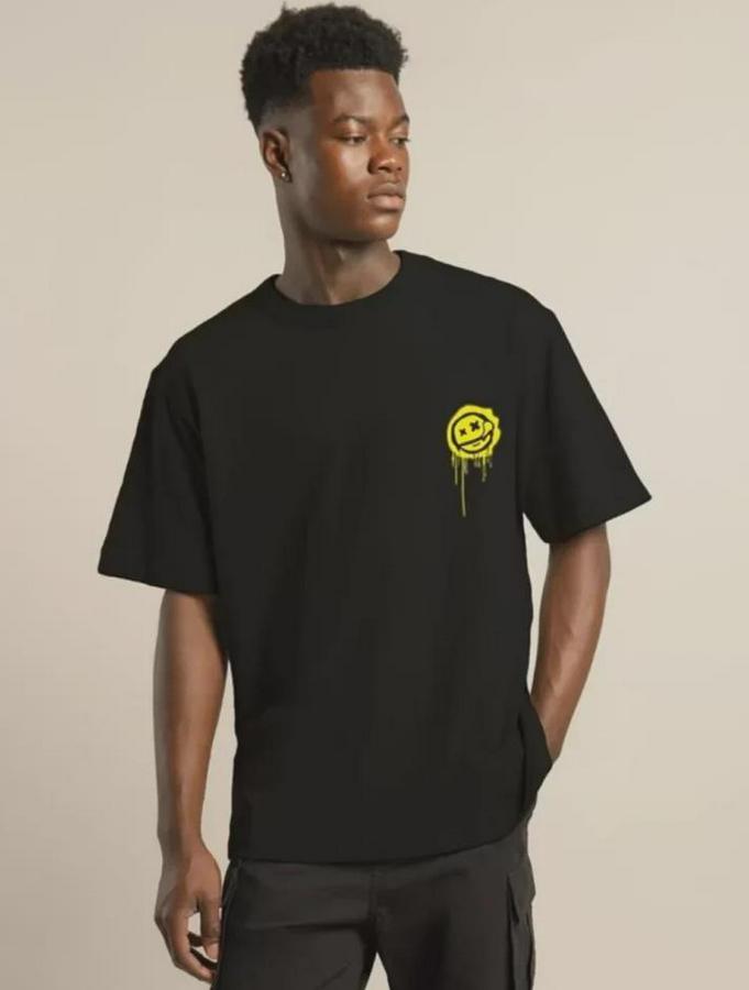 Unisex Bisiklet Yaka Baskılı Oversize T-Shirt - Siyah