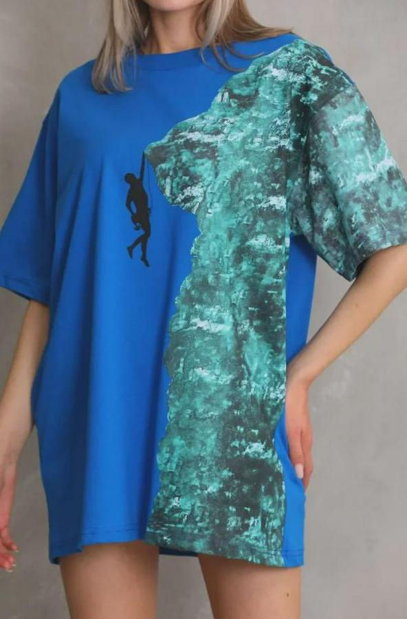 Unisex Bisiklet Yaka Baskılı Oversize T-Shirt - Mavi