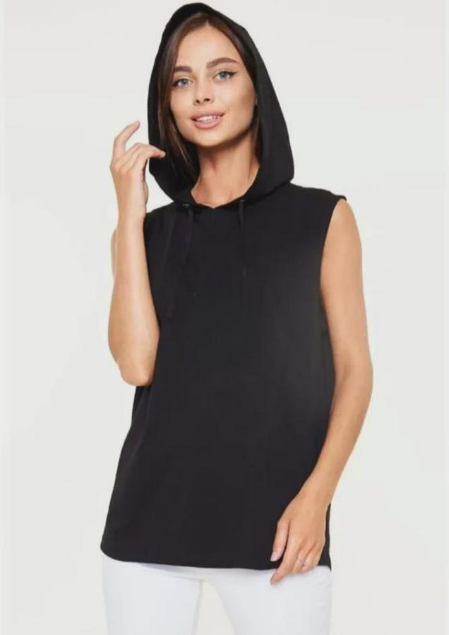 Unisex Kapşonlu Kolsuz Düz Oversize T-shirt - Siyah