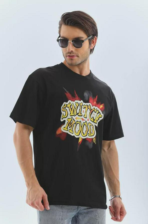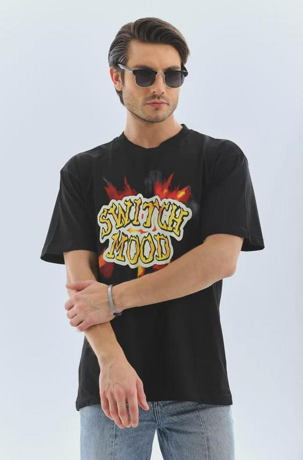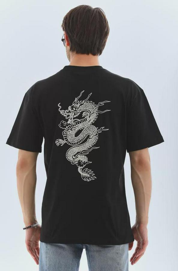 Unisex Oversize Baskılı Bisiklet Yaka T-Shirt - Siyah