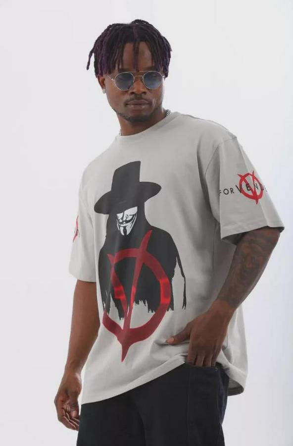 Unisex Oversize Baskılı Bisiklet Yaka T-Shirt - Gri