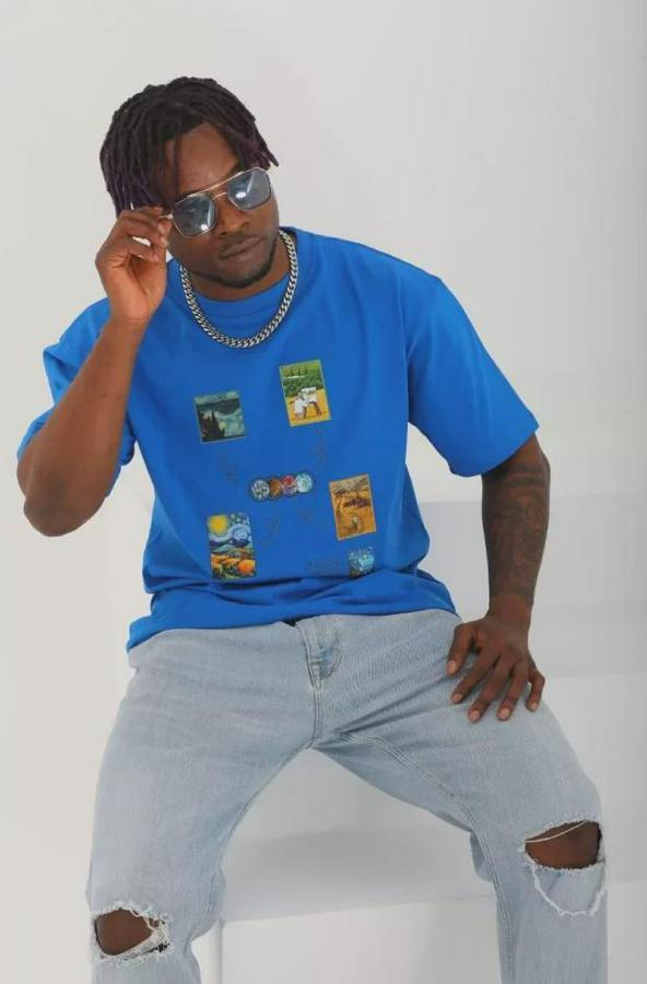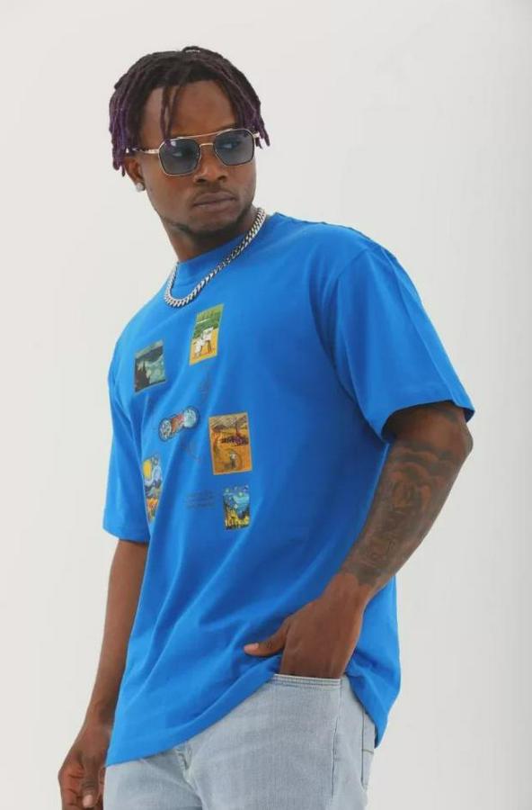 Unisex Oversize Baskılı Bisiklet Yaka T-Shirt - Mavi