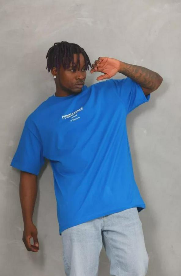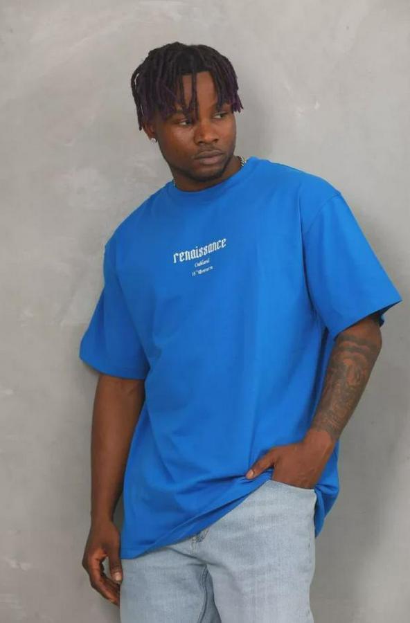 Unisex Oversize Baskılı Bisiklet Yaka T-Shirt - Mavi