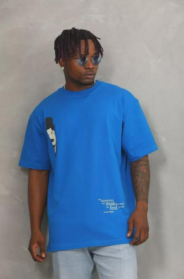 Unisex Oversize Baskılı Bisiklet Yaka T-Shirt - Mavi
