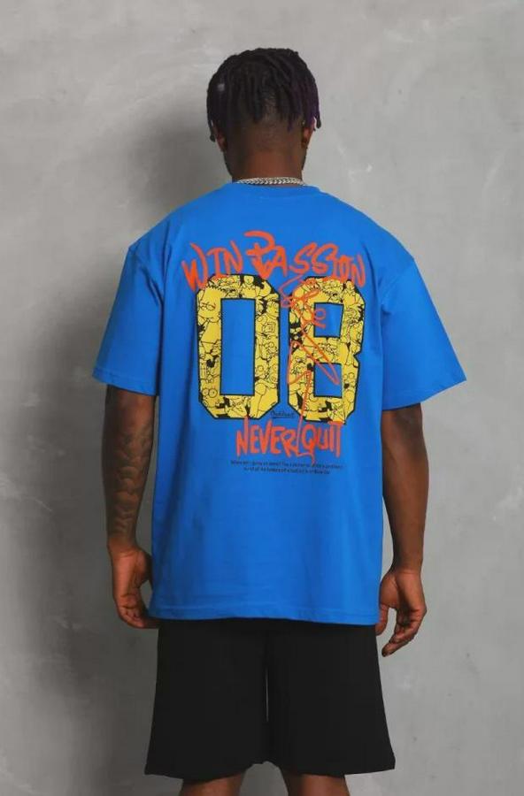 Unisex Oversize Baskılı Bisiklet Yaka T-Shirt - Mavi