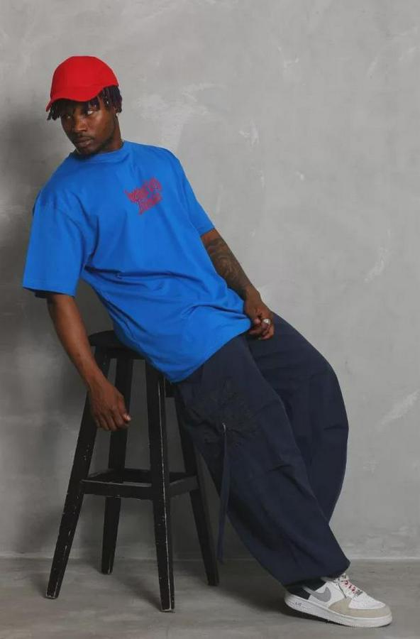 Unisex Oversize Baskılı Bisiklet Yaka T-Shirt - Mavi