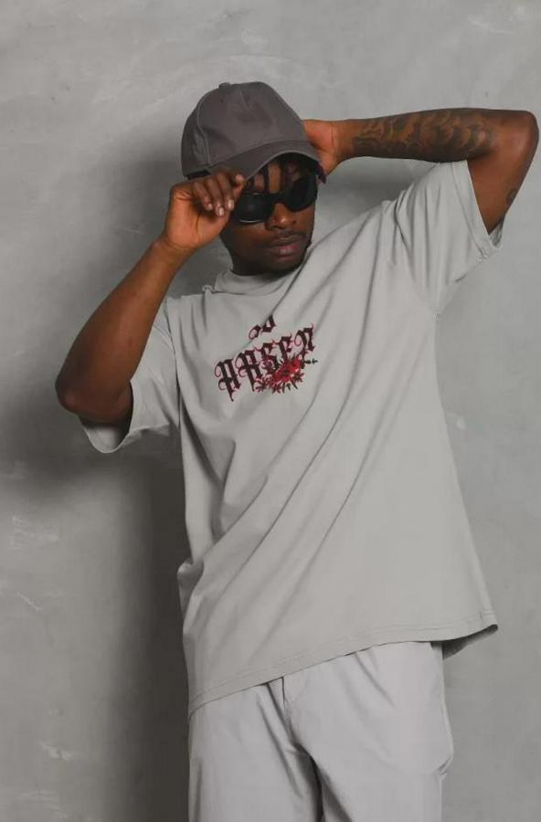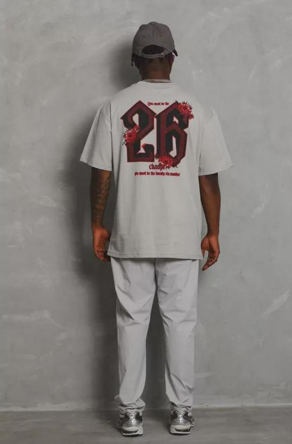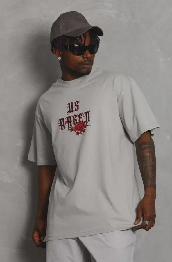 Unisex Oversize Baskılı Bisiklet Yaka T-Shirt - Gri