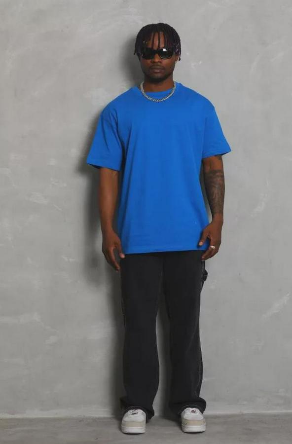 Unisex Oversize Düz Bisiklet Yaka T-Shirt - Mavi