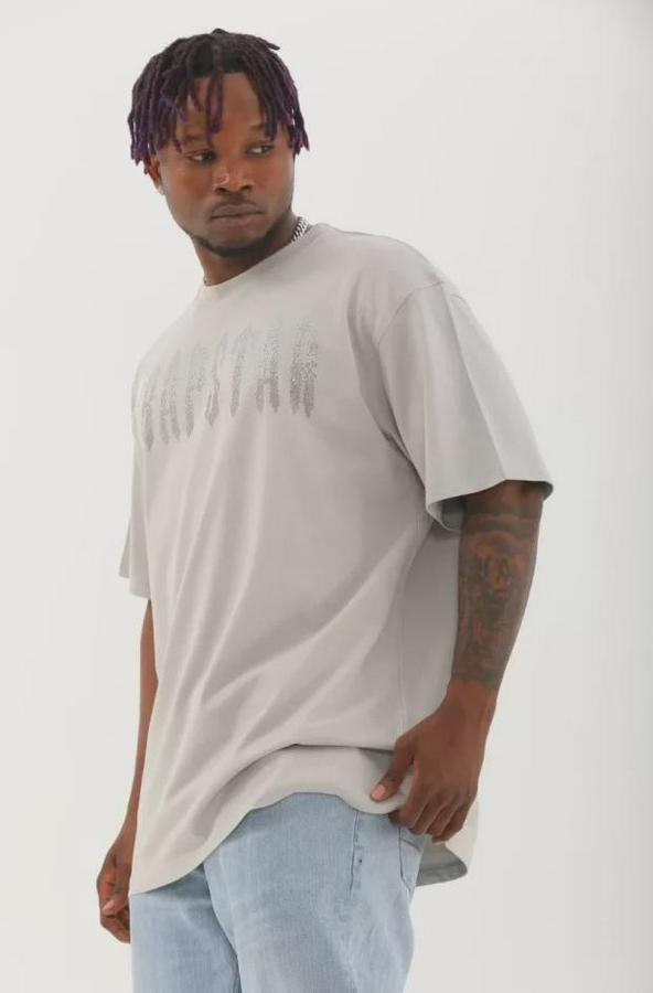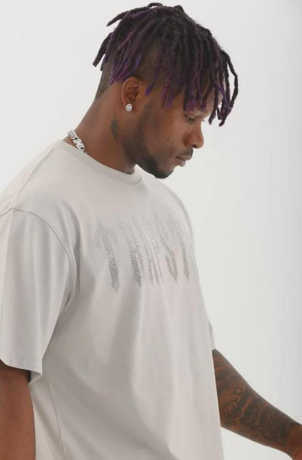 Unisex Oversize Taşlı Bisiklet Yaka T-Shirt - Gri