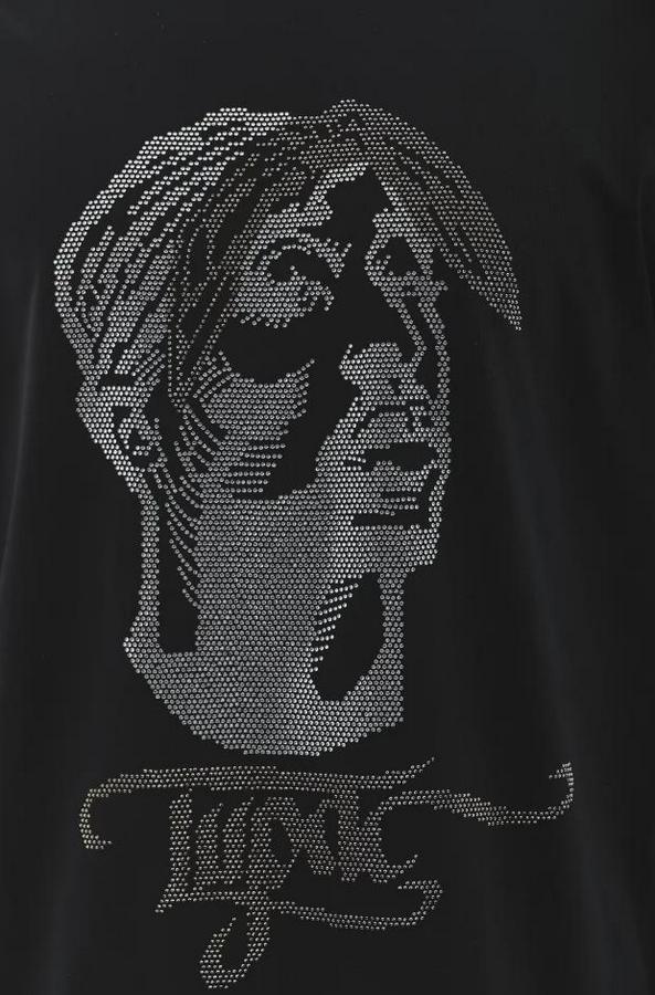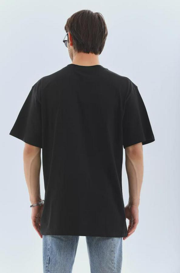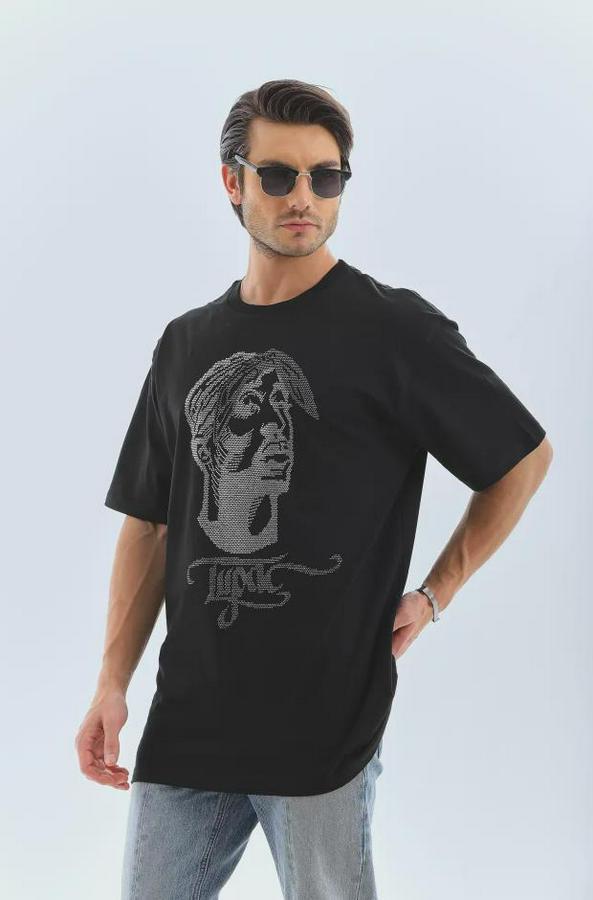 Unisex Oversize Taşlı Bisiklet Yaka T-Shirt - Siyah