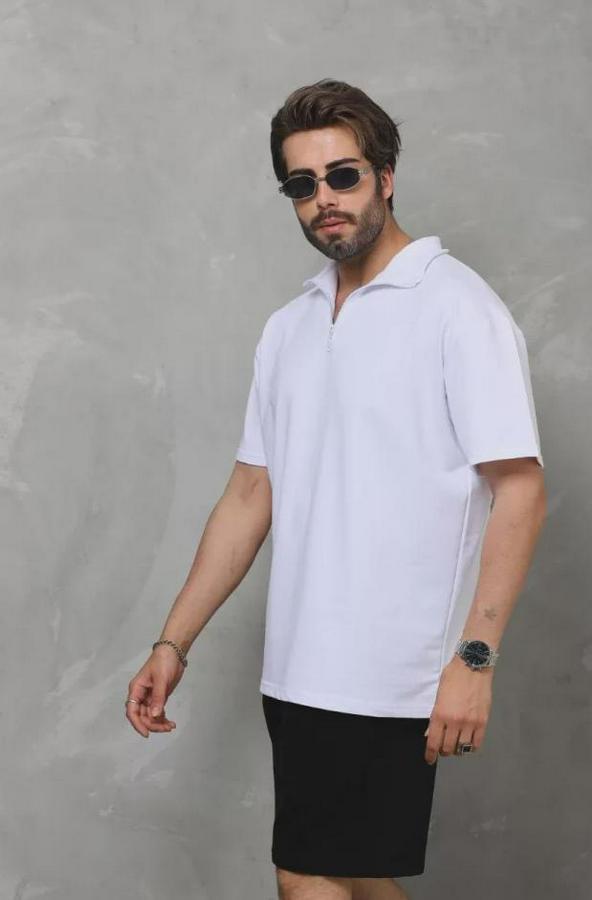 Unisex Yarım Fermuarlı Düz Oversize T-shirt - Beyaz