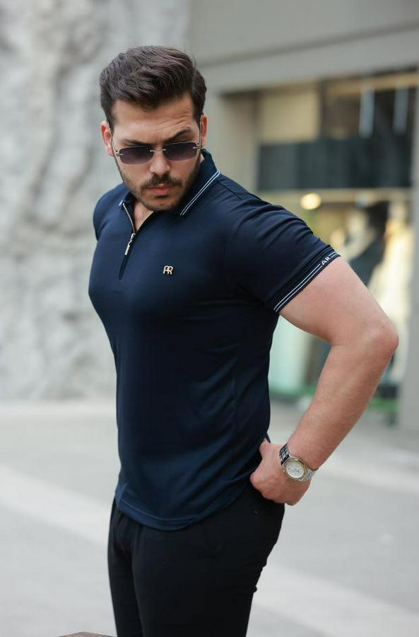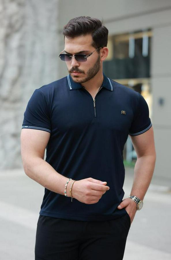 Erkek Yaka Ve Kolları çizgi Detaylı Fermuar Yakalı Kısa Kollu Tişört